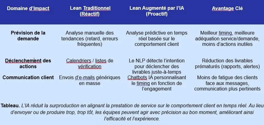 Ces exemples illustrent comment l’IA transforme la prestation de services, en passant de réponses réactives et planifiées à des actions juste-à-temps, parfaitement alignées sur les besoins du client, éliminant ainsi les coûts invisibles liés à un excès d’activité trop précoce.